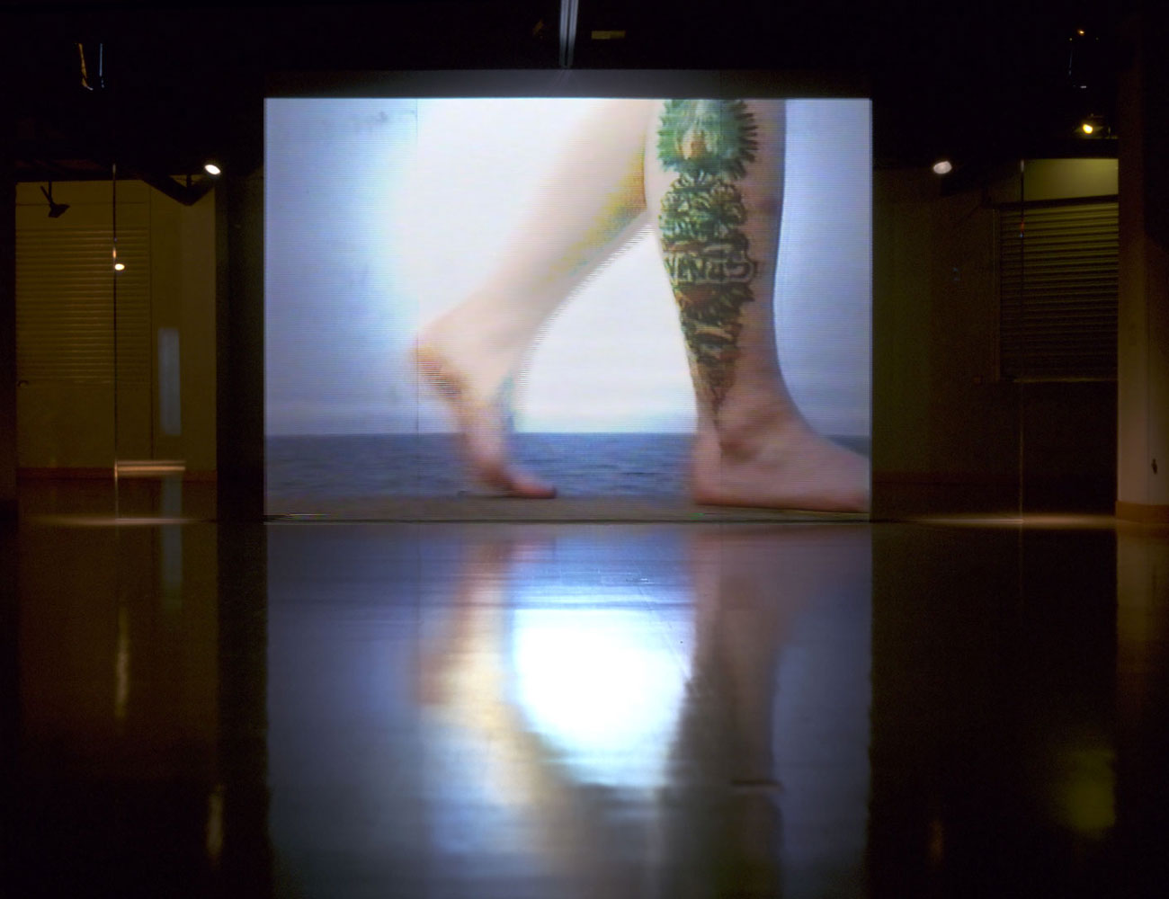 The Northern Gallery for Contemporary Art had once been a large department store. In this installation the artist re-establishes the original huge plate glass windows into the building as projection screens, introducing elements of figurative classical ornamentation but using real women as actors.